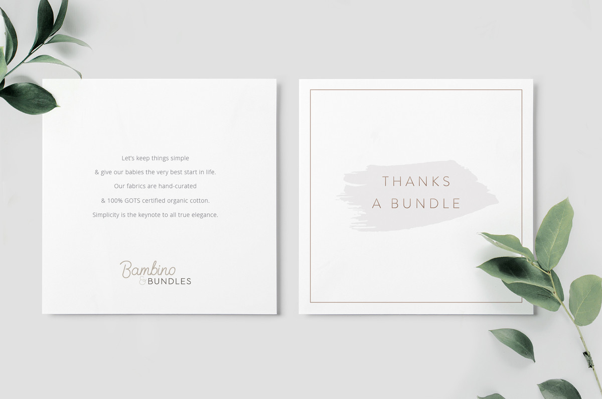 Bambino & Bundles was born out of a desire for beautiful and simple products made with awareness using fabrics that are 100% GOTS-certified organic cotton. The brief was to create a sophisticated and elegant brand that tied in with their ethos: A babywear brand with a simple and clear philosophy: to keep things simple and give babies the very best start in life.